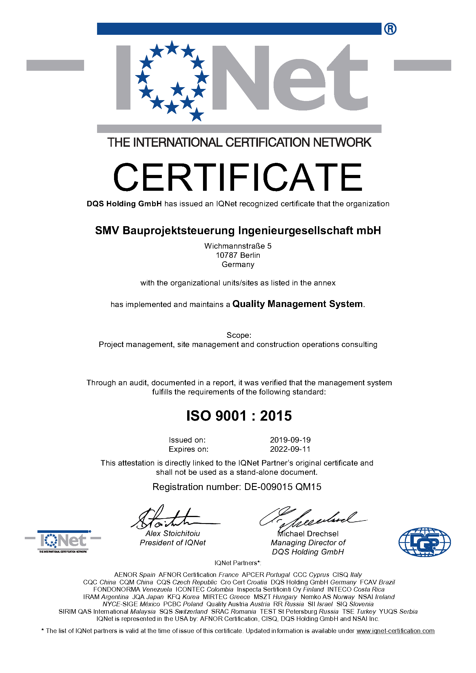 Unser Zertifikat für die Anwendung des Qualitätsmanagementsystems nach ISO 9001:2015 hat nun Gültigkeit für die gesamte SMV-Gruppe in Hamburg, Berlin, Frankfurt am Main und München.